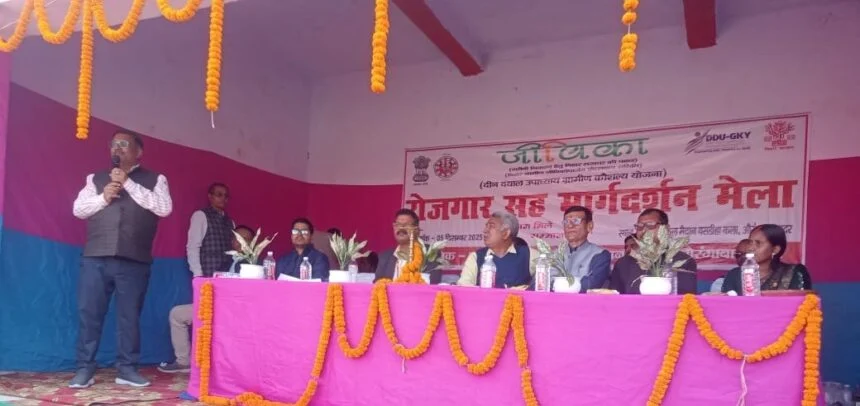 औरंगाबाद। जीविका सदर औरंगाबाद द्वारा दीनदयाल उपाध्याय ग्रामीण कौशल योजना के तहत ग्रामीण युवाओं को नियोजन और स्वरोजगार के उद्वेश्य से +2 हाई स्कूल मैदान बसडीहा कला में रोजगार सह मार्गदर्शन मेला का आयोजन किया गया। मेले का शुभारंभ जिला परियोजना प्रबंधक जीविका पवन कुमार, निर्देशक ग्रामीण स्वरोजगार प्रशिक्षण संस्थान राज कुमार, विकास पदाधिकारी भारतीय जीवन बीमा निगम, प्रधानाचार्य मध्य विद्यालय कौशल किशोर, प्रबंधक वित्त पवन कुमार सिंह, प्रबंधक मानव संसाधन युवराज कुमार, प्रबंधक रोजगार दिलीप कुमार गुप्ता, प्रखंड परियोजना प्रबंधक श्रुतिकांत पाठक और हरियाली संकुल स्तरीय संघ के अध्यक्षा प्रतिमा देवी द्वारा संयुक्त रूप से दीप प्रज्जलित कर किया गया। सभी अतिथियों को अंगवस्त्र देकर सम्मानित किया गया।