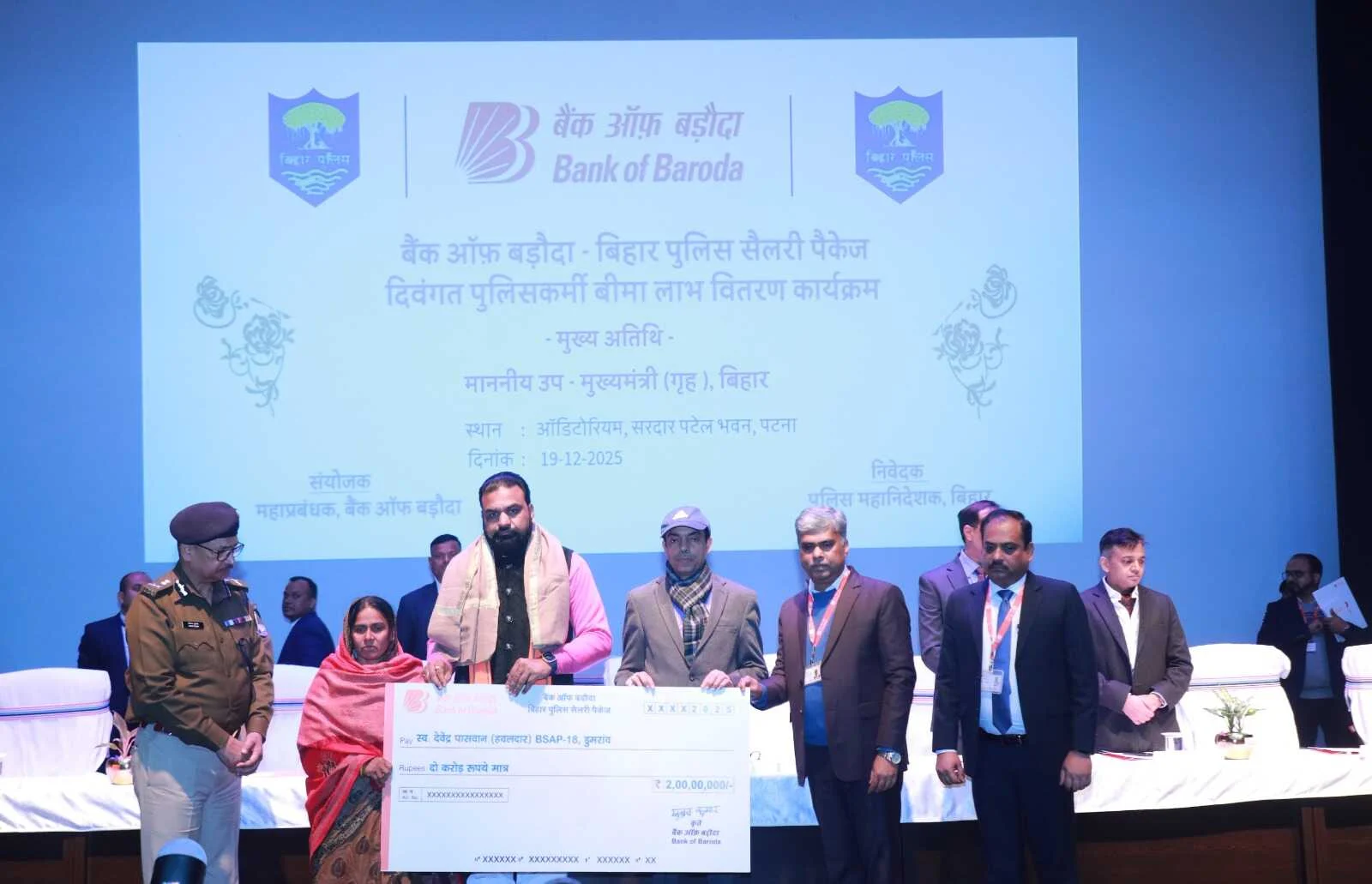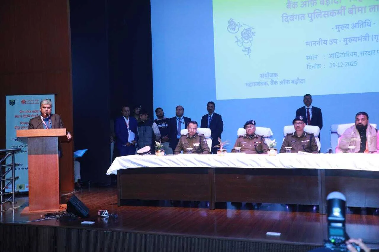 पटना। बिहार के गृह मंत्री सम्राट चौधरी ने बिहार पुलिस मुख्यालय, पटना में आयोजित एक समारोह में बैंक ऑफ बड़ौदा की पुलिस सैलरी पैकेज योजना के अंतर्गत 36 दिवंगत पुलिसकर्मियों के परिजनों को कुल 25.65 करोड़ की राशि वितरित की। यह कार्यक्रम सरदार पटेल भवन के सभागार में आयोजित किया गया, जिसमें पुलिस एवं गृह विभाग के कई वरिष्ठ अधिकारी उपस्थित रहे। प्रमुख रूप से पुलिस महानिदेशक विनय कुमार, अपर मुख्य सचिव (गृह) अरविंद कुमार चौधरी, गृह सचिव प्रणव कुमार, ओएसडी (गृह) संजय कुमार सिंह, अपर पुलिस महानिदेशक (मुख्यालय) कुंदन कृष्णन तथा अपर पुलिस महानिदेशक (बजट) डॉ. कमल किशोर सिंह शामिल थे।
