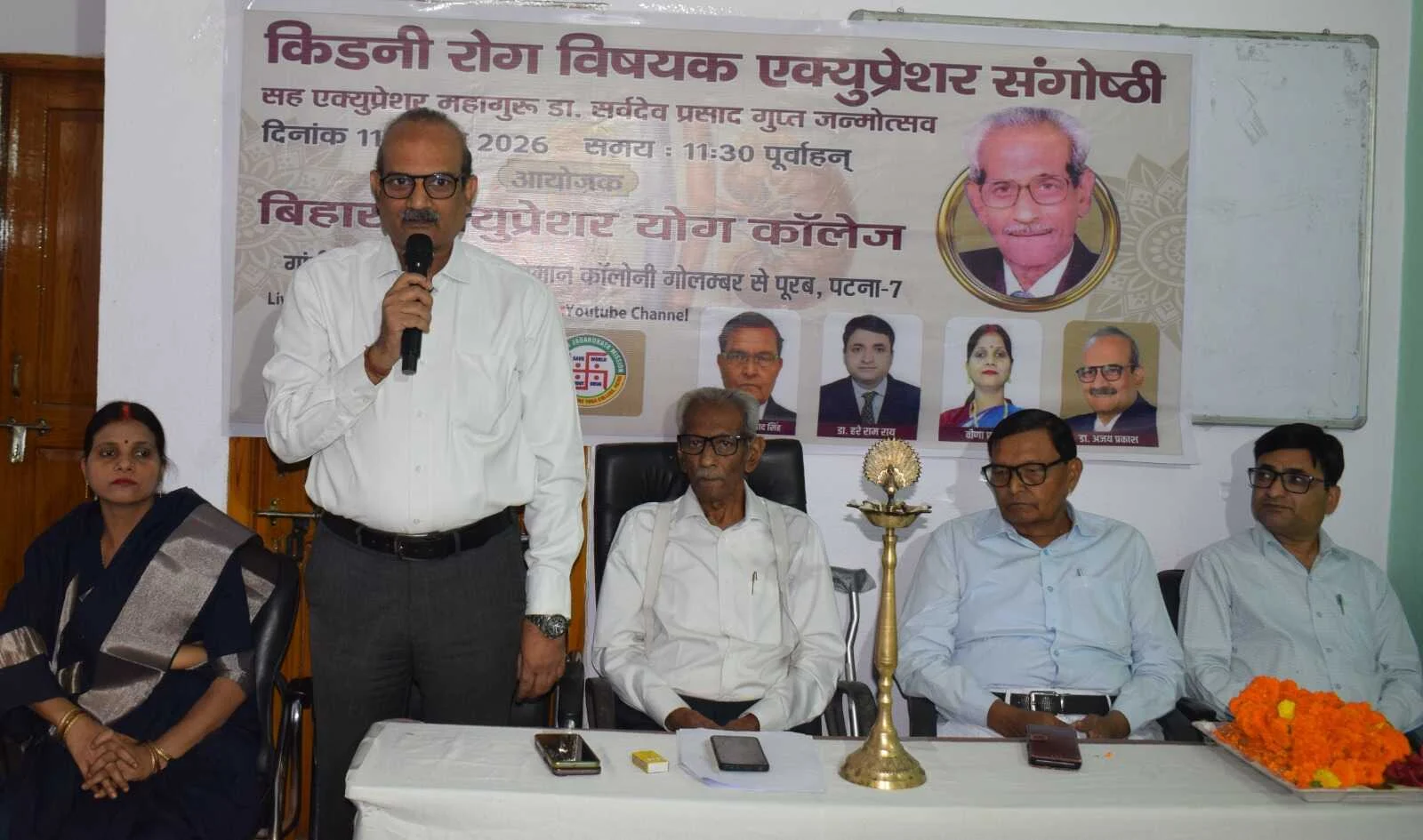पटना। बिहार एक्युप्रेशर योग कॉलेज द्वारा बिस्कोमान कॉलोनी गोलंबर स्थित परिसर में किडनी रोग विषयक एक्युप्रेशर संगोष्ठी का आयोजन किया गया। इस अवसर पर एक्युप्रेशर महागुरु डॉ. सर्वदेव प्रसाद गुप्त ने कहा कि किडनी फेलियर में एक्युप्रेशर चिकित्सा अत्यंत लाभदायक साबित हो रही है।