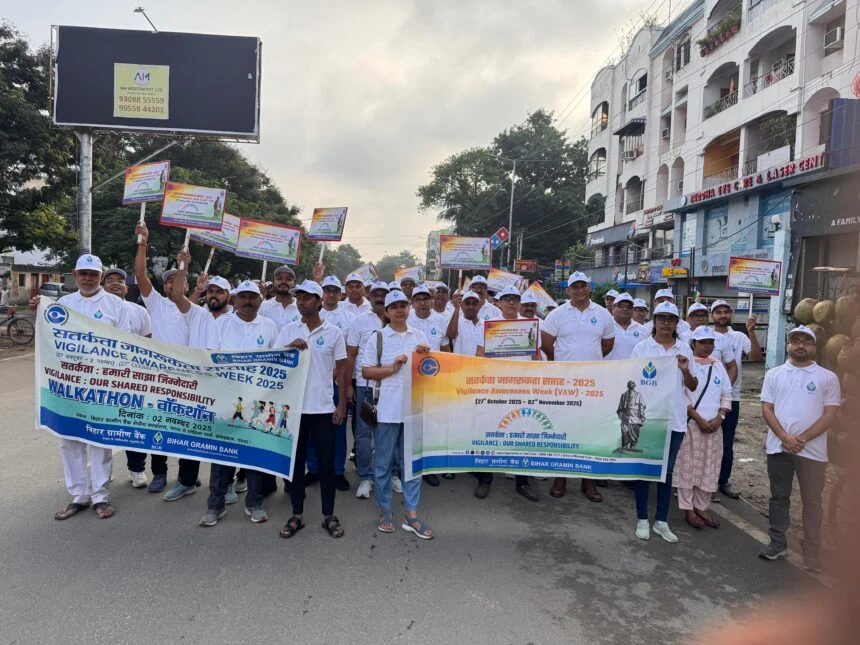 पटना। बिहार ग्रामीण बैंक द्वारा दिनांक 27.10.2025 से 02.11.2025 तक पूरे राज्य में सतर्कता जागरूकता सप्ताह मनाया जा रहा है। इस अवसर पर आम नागरिकों में सतर्कता : हमारी साझा जिम्मेदारी की भावना जागृत किये जाने हेतु बिहार ग्रामीण बैंक प्रधान कार्यालय पटना एवं क्षेत्रीय कार्यालय पटना द्वारा संयुक्त रूप से रविवार को प्रभात फेरी का आयोजन किया गया जिसका नेतृत्व बिहार ग्रामीण बैंक के अध्यक्ष मुकुल सहाय ने किया।