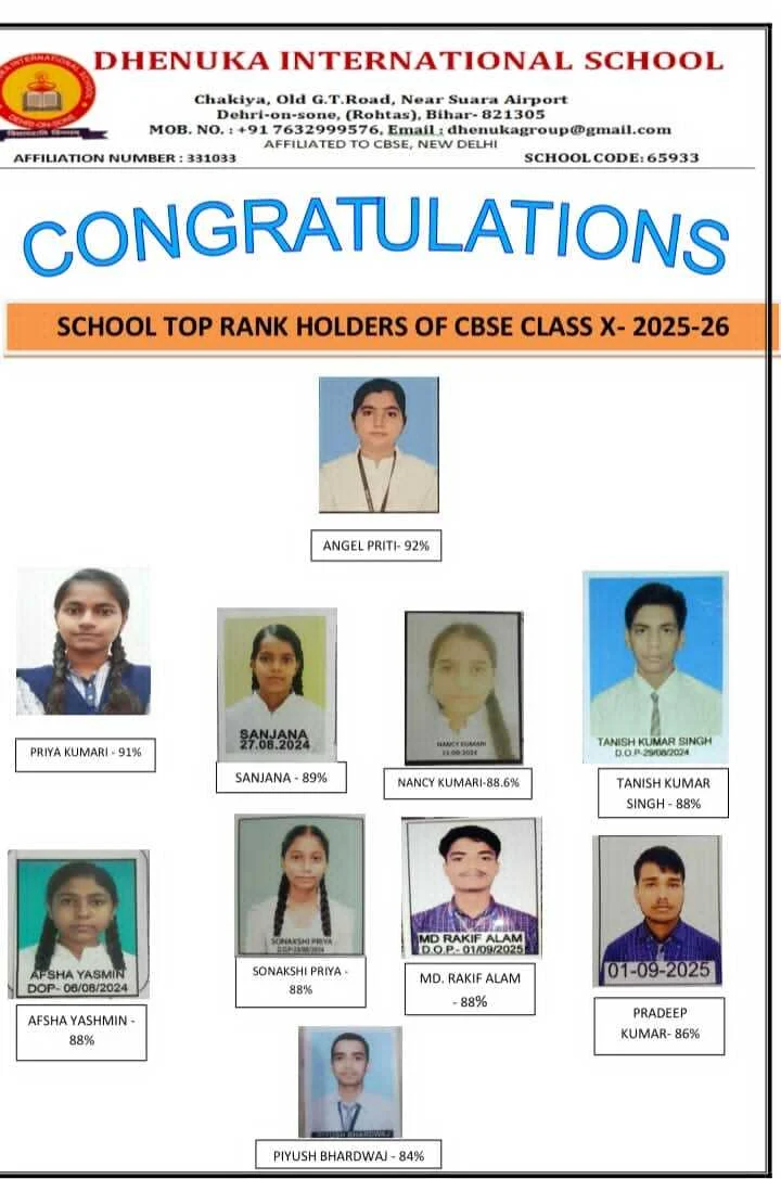 डेहरी-ऑन-सोन (रोहतास)। सुअरा चकिया स्थित धेनुका इंटरनेशनल स्कूल ने एक बार फिर शैक्षणिक उत्कृष्टता की मिसाल पेश करते हुए सीबीएसई द्वारा घोषित 10वीं बोर्ड परीक्षा में शत-प्रतिशत परिणाम हासिल किया है। विद्यालय के छात्रों ने शानदार प्रदर्शन कर स्कूल का नाम गौरवान्वित किया।