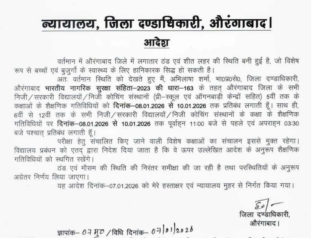 आदेश के अनुसार औरंगाबाद जिला अंतर्गत सभी सरकारी एवं निजी विद्यालयों तथा निजी कोचिंग संस्थानों (प्री-स्कूल एवं आँगनबाड़ी केन्द्रों सहित) में कक्षा पाँचवीं तक की समस्त शैक्षणिक गतिविधियों पर दिनांक 08.01.2026 से 10.01.2026 तक पूर्णतः प्रतिबंध रहेगा।