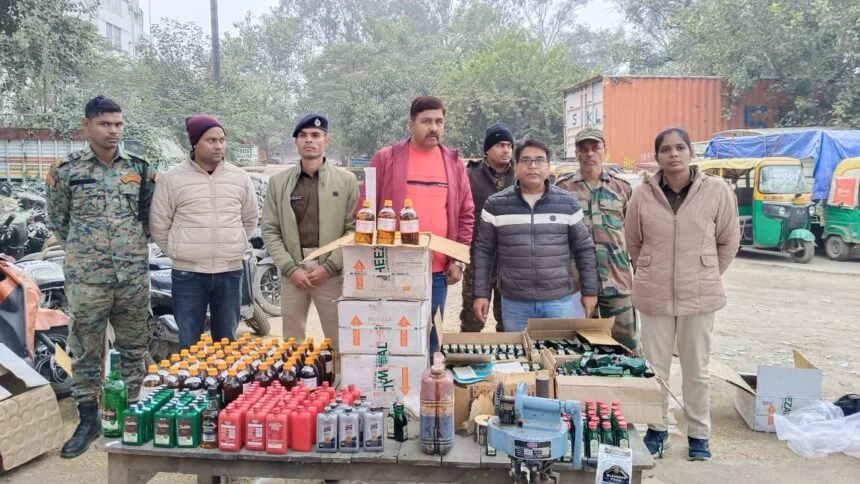 फुलवारी शरीफ। नए साल से ठीक पहले पटना में नकली विदेशी शराब के बड़े रैकेट का खुलासा हुआ है. रामकृष्ण नगर थाना क्षेत्र के जगदंबा कॉलोनी, खेमनीचक स्थित एक मकान में लॉज की तरह बनाए गए कमरों में नकली शराब की फैक्ट्री चलाई जा रही थी. मद्य निषेध विभाग की टीम ने गुप्त सूचना के आधार पर छापेमारी कर भारी मात्रा में निर्मित व अर्धनिर्मित नकली शराब, केमिकल, स्प्रिट, बोतल, ढक्कन, रैपर, क्यूआर कोड, स्टिकर और पैकिंग मशीन बरामद की है।