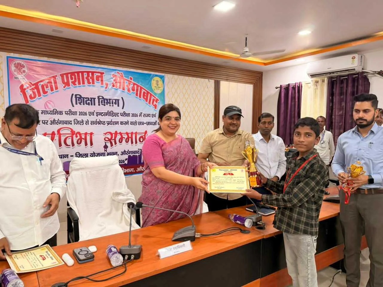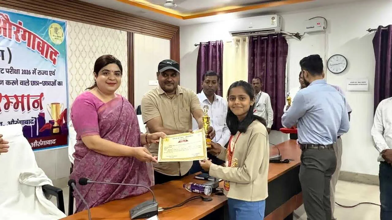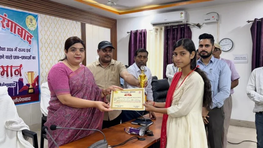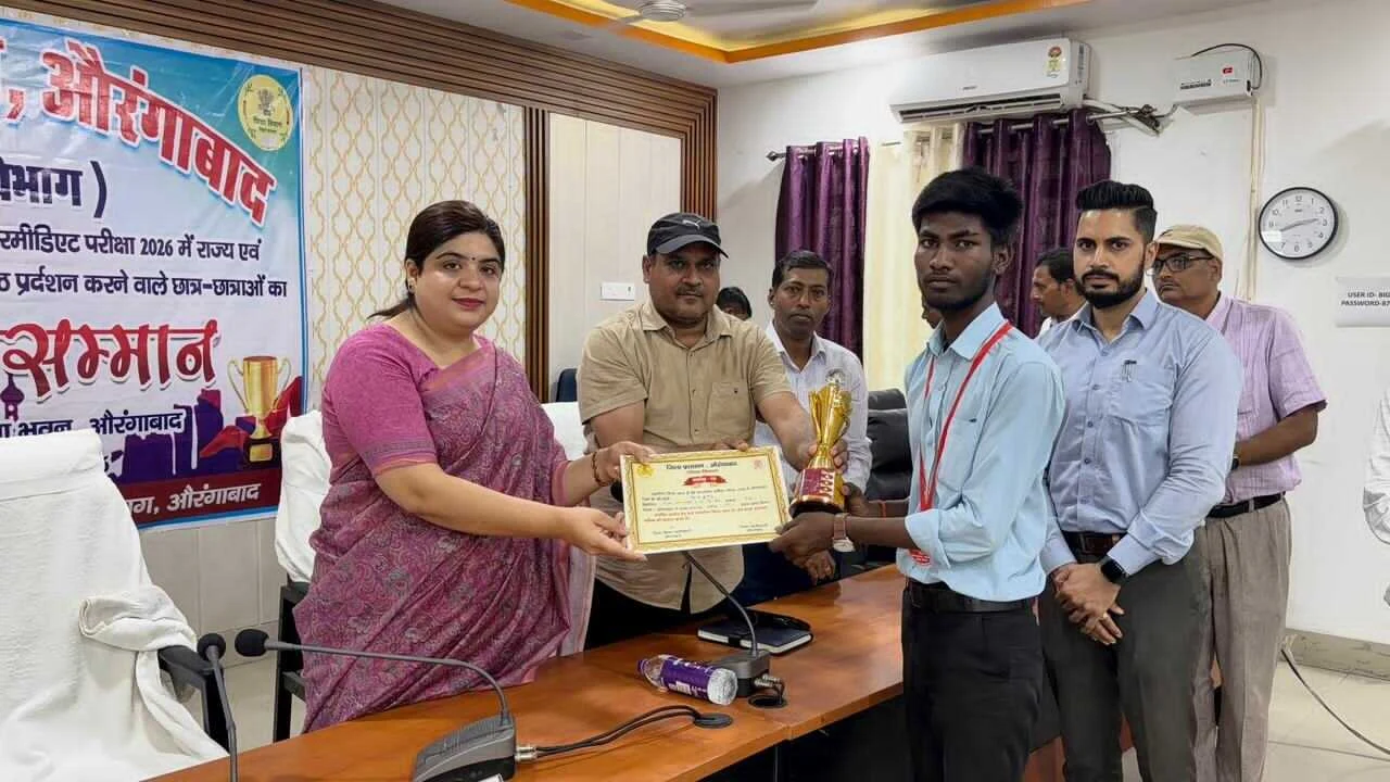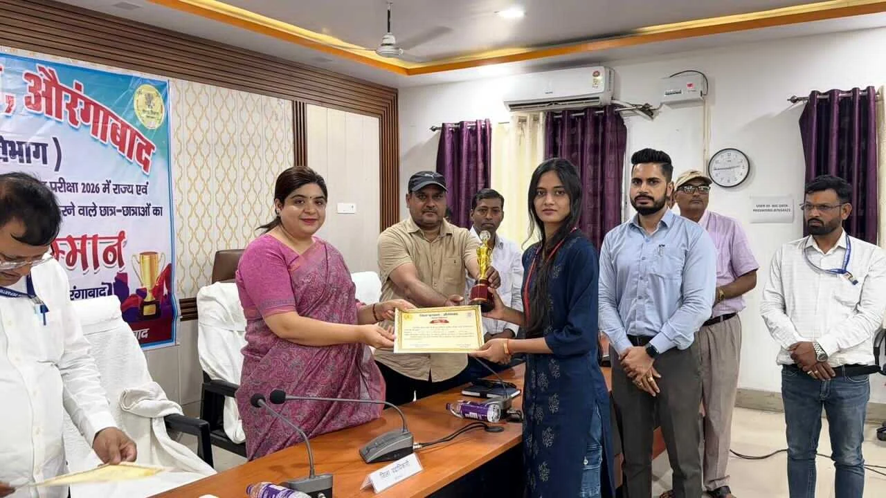 औरंगाबाद। आज जिला पदाधिकारी अभिलाषा शर्मा द्वारा समाहरणालय स्थित योजना भवन के सभा कक्ष में बिहार विद्यालय परीक्षा समिति, पटना द्वारा आयोजित वार्षिक माध्यमिक (सैद्धांतिक) परीक्षा 2026 एवं इंटरमीडिएट वार्षिक परीक्षा 2026 में राज्य एवं जिला स्तर पर उत्कृष्ट प्रदर्शन करने वाले छात्र-छात्राओं को प्रशस्ति प्रमाण-पत्र एवं पुरस्कार देकर सम्मानित किया गया।