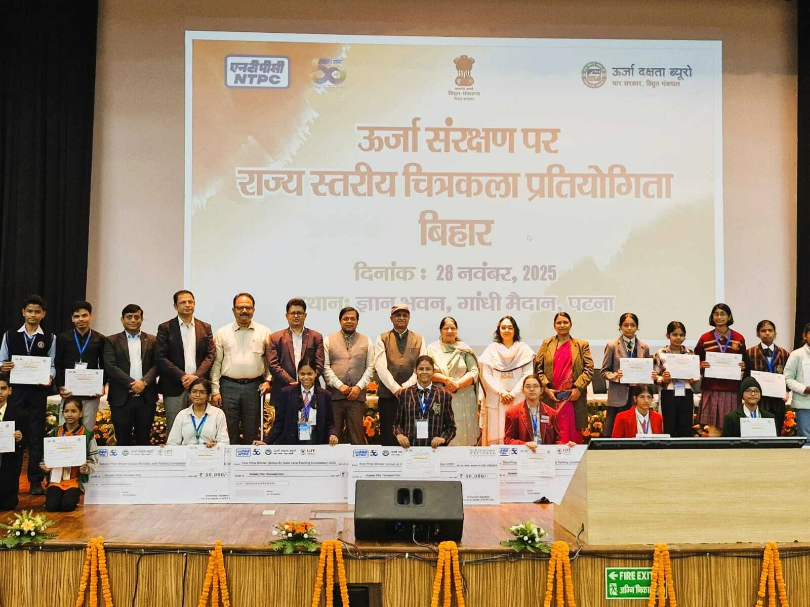 पटना। एनटीपीसी पूर्वी क्षेत्र-1 मुख्यालय ने आज ज्ञान भवन, पटना में ऊर्जा संरक्षण–2025 पर बीईई राज्य स्तरीय पेंटिंग प्रतियोगिता का सफल आयोजन किया। इस कार्यक्रम ने स्कूली छात्रों को ऊर्जा संरक्षण एवं पर्यावरण सुरक्षा पर अपनी सोच व कल्पनाओं को चित्रों में अभिव्यक्त करने का सशक्त मंच प्रदान किया। कुल 100 चयनित छात्र-छात्राओं ने ऑन-द- स्पॉट पेंटिंग के माध्यम से ऊर्जा संरक्षण का प्रभावशाली संदेश दिया, जिससे बच्चों में ऊर्जा-संरक्षण के प्रति रचनात्मक जोश देखने को मिला।