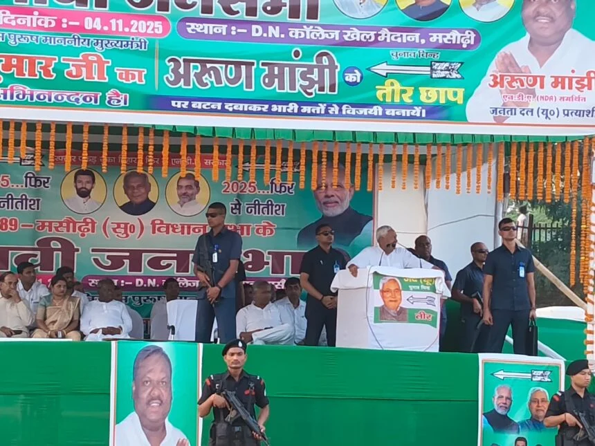 मसौढ़ी। मुख्यमंत्री नीतीश कुमार ने मंगलवार को मसौढी के डीएन कॉलेज खेल मैदान में आयोजित चुनावी सभा को संबोधित किया। उन्होंने जदयू प्रत्याशी अरुण मांझी के पक्ष में वोट देने की अपील की, कार्यक्रम की अध्यक्षता जदयू नगर अध्यक्ष अश्विनी उर्फ गोल्डी ने की, मंच का संचालन भाजपा के रविंद्र सिंह ने किया।